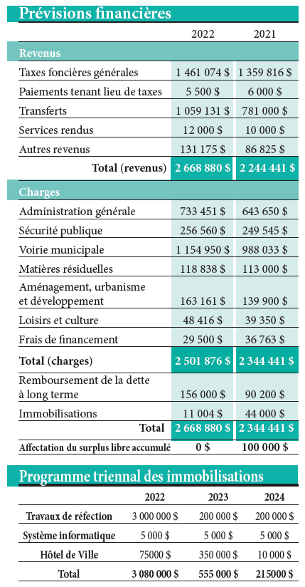 Au niveau du budget de fonctionnement, nous vous confirmons une baisse du taux de taxes de deux cents (0.02$/100$), cependant Ivry-sur-le-Lac a reçu en fin d’année 2021 le nouveau rôle triennal d’évaluation, ce qui représentera une hausse du compte de taxes pour certains, et ce, même si le conseil a convenu de baisser le taux de taxes. La hausse des évaluations foncières est une excellente nouvelle puisqu’elle signifie que notre magnifique territoire est très convoité et nous sommes chanceux d’y être résident!