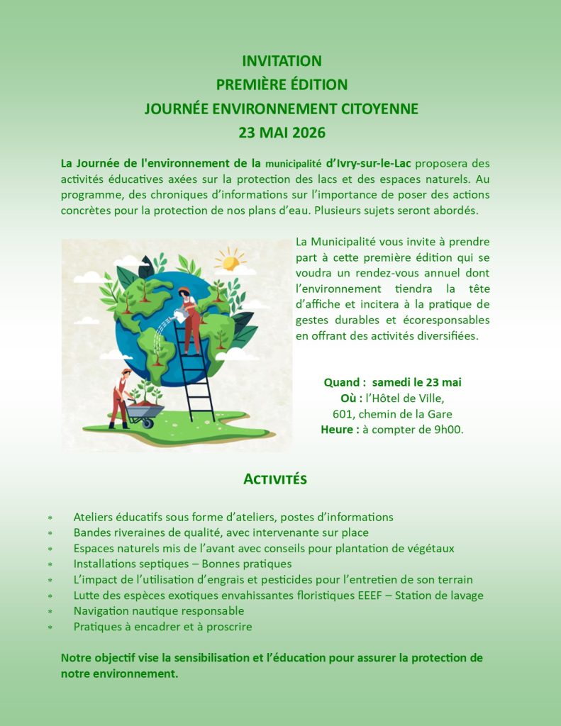 The wash does not apply to waterfront residents whose boats remain on their property (or in their boathouse) all winter and who never navigate in other bodies of water. The purpose of this exception is not to oblige a waterfront resident to take his or her boat out for washing, however, they will have to fill out the undertaking contained in the form confirming that their boat has been stored on their own property and has not been in a lake other than those of the Municipality of Ivry-sur-le-Lac.